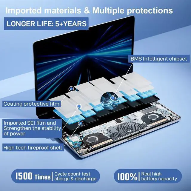 Battery Advantages: 1. More than 1500+ recharge cycles over the life of the battery; 2.100 % Safe with Upgrade chip to ensure 6-fold protection, eg. Intelligent temperature control--Over heat protection, Over charging protection, Short circuit protection..... Without (swollen battery) Damage to laptop,