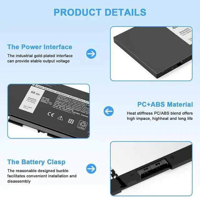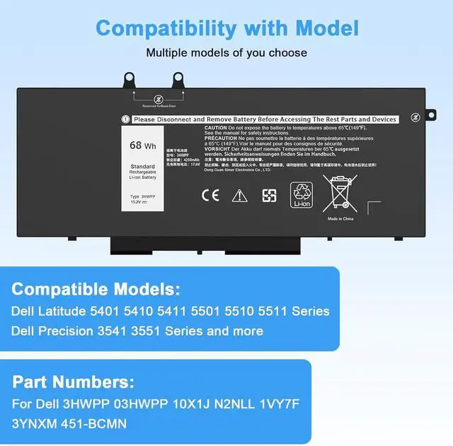 Replacement Battery Part Numbers: Compatible with Dell Latitude 3HWPP 03HWPP 10X1J N2NLL 1VY7F 3YNXM 451-BCMN; 68 wh type 3hwpp laptop battery replacement