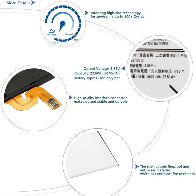 ANTIEE PromiseEvery one of our replacement batteries has undergone rigorous testing to ensure the true charge capacity, circuit protection, stable current, low self-discharge. And our batteries are UL / CE / FCC / RoHS Certified for safety, it can provide up to 500 charging cycles over the life.
