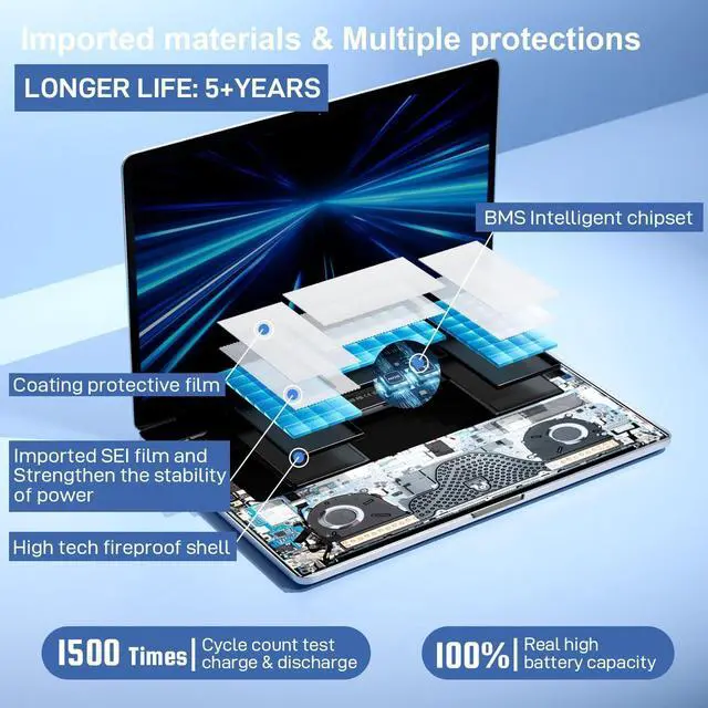 Battery Advantages: 1. More than 1500+ recharge cycles over the life of the battery; 2.100 % Safe with Upgrade chip to ensure 6-fold protection, eg. Intelligent temperature control--Over heat protection, Over charging protection, Short circuit protection..... Without (swollen battery) Damage to laptop,