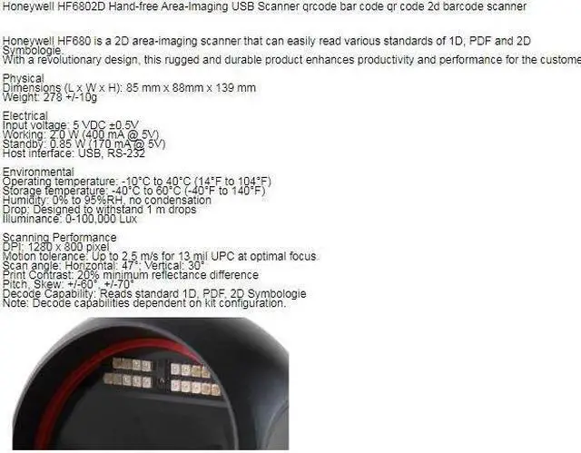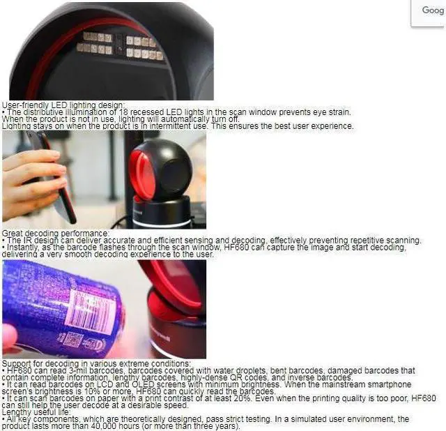 Great decoding performance: • The IR design can deliver accurate and efficient sensing and decoding, effectively preventing repetitive scanning. • Instantly, as the barcode flashes through the scan window, HF680 can capture the image and start decoding, delivering a very smooth decoding experience to the user. • HF680 can read 3-mil barcodes, barcodes covered with water droplets, bent barcodes, damaged barcodes that contain complete information, lengthy barcodes, highly-dense QR codes, and inverse barcodes. • It can read barcodes on LCD and OLED screens with minimum brightness. When the mainstream smartphone screen’s brightness is 10% or more, HF680 can quickly read the barcodes. • It can scan barcodes on paper with a print contrast of at least 20%. Even when the printing quality is too poor, HF680 can still help the user decode at a desirable speed.