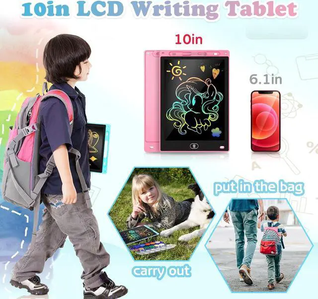 Portable and Eyesight FriendlyThe Drawing Board adopts pressure-sensitive flexible screen, with features of no radiation, no glare, no blue light, no harm to eyesight.. 10 inches of writing area, 0.27 -inch ultra-thin design, 5 ounces weight, hardly feel the weight of the LCD writing tablet for kids, which is convenient to carry with bag.