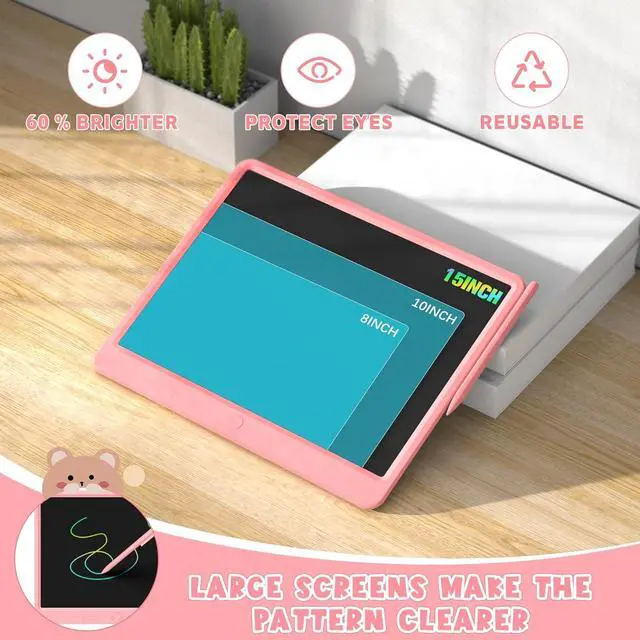 Newest Eye Protection LCD Writing TabletOur 15 inch writing tablet adopts custom-made color LCD film, attracting the baby's attention with comfortable colors. The optical properties are exactly the same as ordinary paper, no radiation, no glare, no blue light, protect kid's eyes, mother is more at ease. The 15 inch large screen provides enough space for graffiti to accommodate more imagination of children, stimulate children's creativity, and record their whimsy anytime, anywhere.
