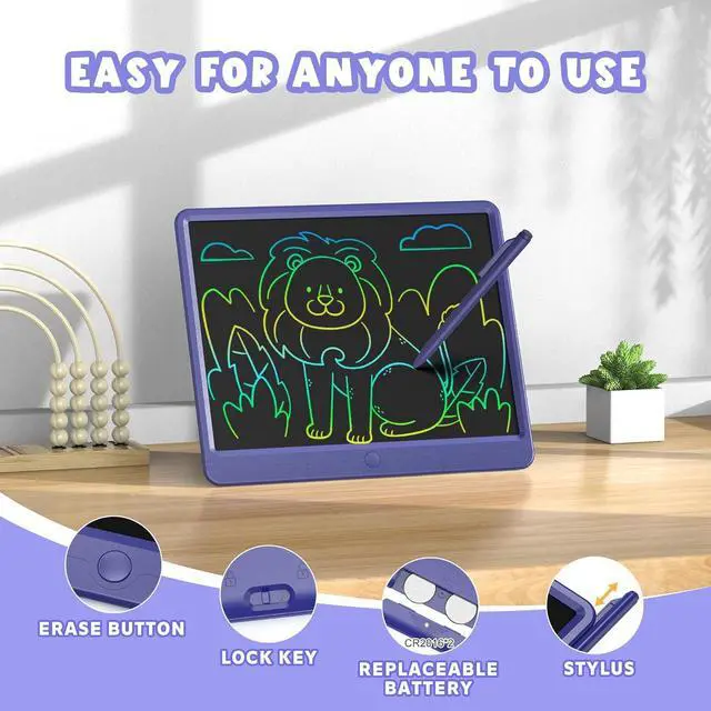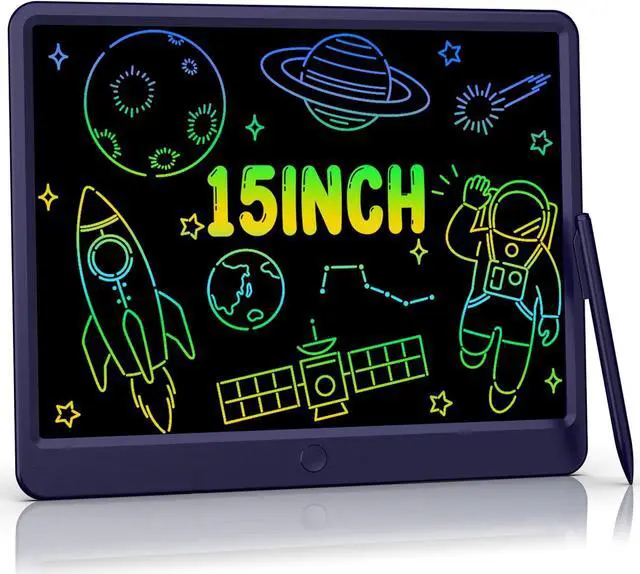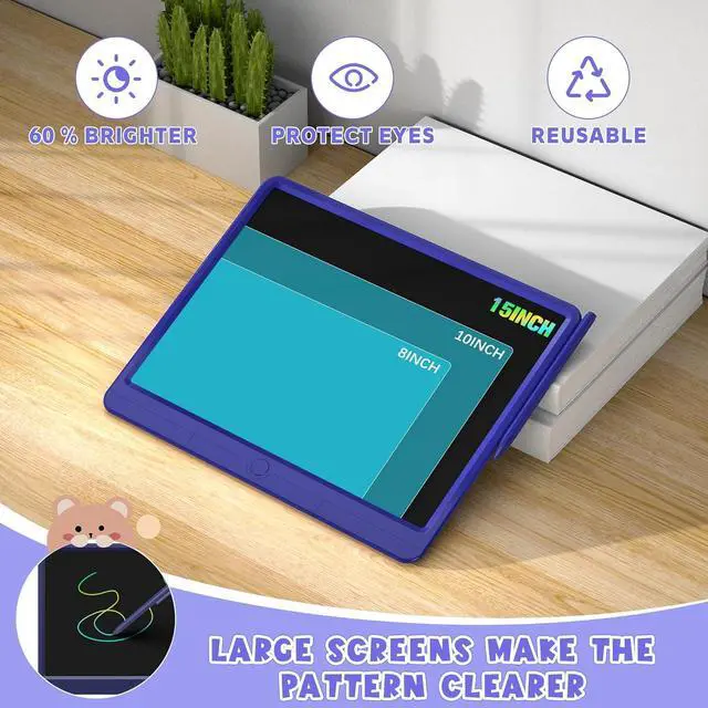 Newest Eye Protection LCD Writing TabletOur 15 inch writing tablet adopts custom-made color LCD film, attracting the baby's attention with comfortable colors. The optical properties are exactly the same as ordinary paper, no radiation, no glare, no blue light, protect kid's eyes, mother is more at ease. The 15 inch large screen provides enough space for graffiti to accommodate more imagination of children, stimulate children's creativity, and record their whimsy anytime, anywhere.
