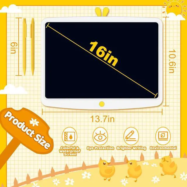 Kids: TUGAU writing board adopt newest LCD pressure-sensitive technology, kids will create different thickness lines with different forces. 16 inches larger screen, brighter and safer, without radiation, no blue light, no glare, provide a better doodle experience for kids aged 3-12.