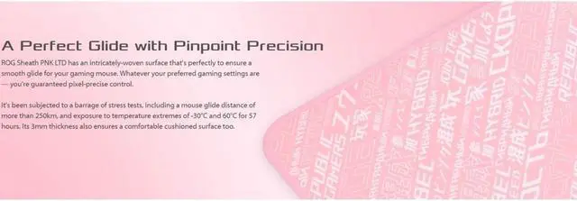 ROG Sheath PNK LTD has an intricately-woven surface thats perfectly to ensure a smooth glide for your gaming mouse. Whatever your preferred gaming settings are - youre guaranteed pixel-precise control.