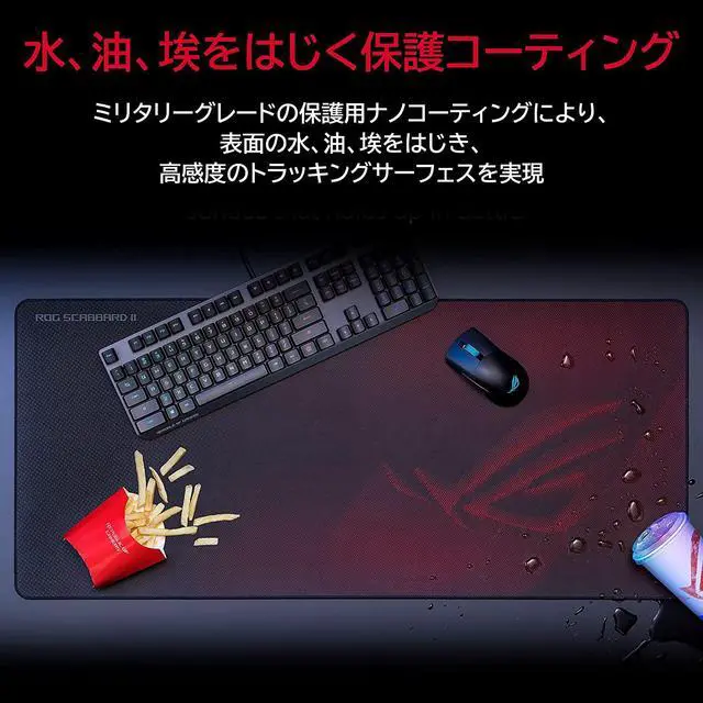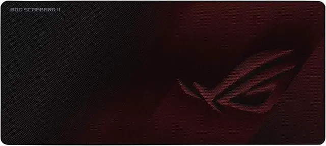 TRIPLE PROTECTION FOR A SMOOTH GLIDE - ROG Scabbard II mouse pad sets the stage for your most epic fights and stunning victories. This extended gaming mouse pad offers ample space for your keyboard, mouse and other gaming gear, making it an ideal staging area before you go into battle. It is made out of durable fabric with a military-grade nano-coating that repels water, oil and dust, giving you an optimal mouse gliding surface. Featuring anti-fray, flat-stitched edges and a non-slip rubber base, ROG Scabbard II is your best gaming ally.