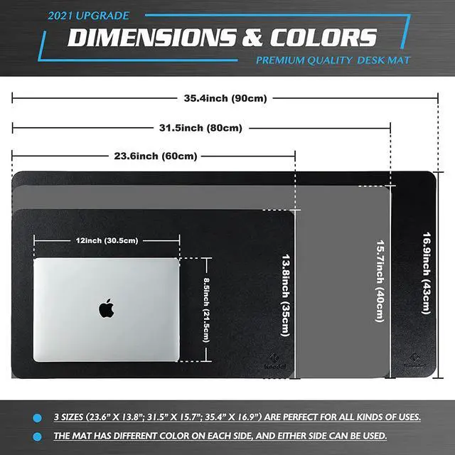 MULTIFUNCTIONAL DESK PAD Size 23.6" x 13.8" / 31.5" x 15.7" / 35.4" x 17", which is large enough to accommodate your laptop, mouse and keyboard. Its comfortable and smooth surface can be a mouse pad and a writing pad. Its non-slip material also adds stability during everyday use.
