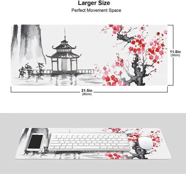 Black And White Japanese Sumi-E Painting Cherry Blossom Temple Art Gaming Mouse Pad Xl Extended Large Mouse Mat Desk Pad Stitched Edges Mousepad Long Non-Slip Rubber Base Mice Pad 31.5 X 11.8 Inch