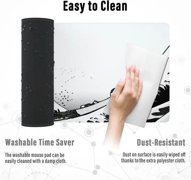 Rubber Base: This large mouse pad gaming is made of soft and dense rubber with non-slip texture on the back side; together the texture and thickness keep the desk mouse pad always firmly in placeEasy to CleanThe washable surface can be easily cleaned with a damp cloth making the computer mouse pad a time saver for cleaning. Dust on the surface can also be easily wiped off