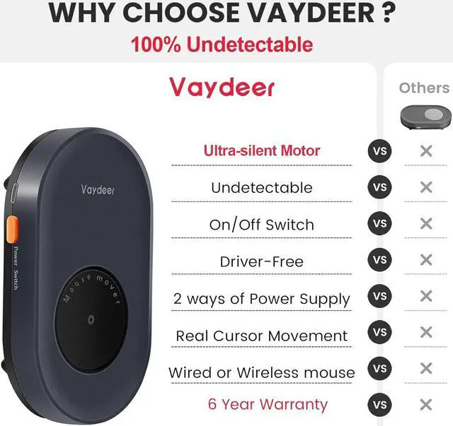 Ultra-Silent with ISO CertifiedHere comes the 2022 upgraded version. With a hardcore ultra-silent motor inside, Vaydeer mouse jiggler only makes soft sound lower than 45dB while working, way more quiet than any other competitors on the market. And it passed the ISO/IEC 27001:2013 security certification. Safe and trustworthy. Great Christmas gift for colleagues.