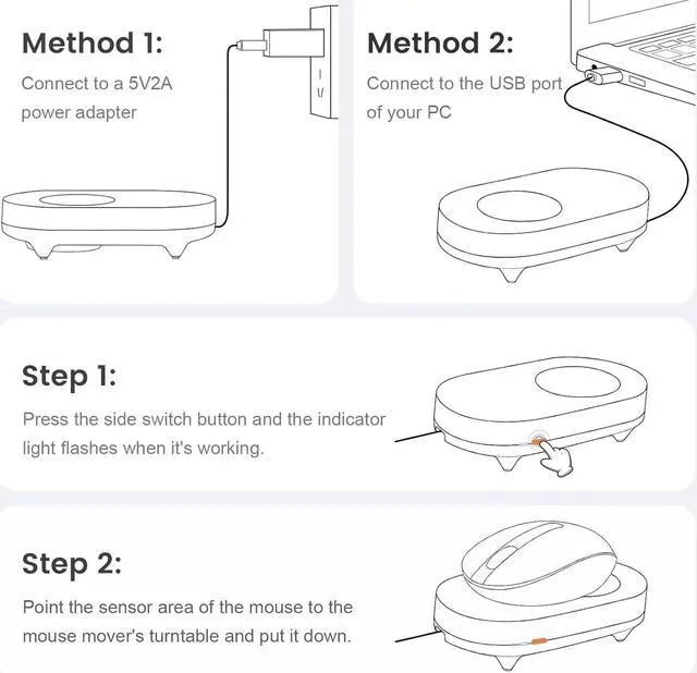 With ON/OFF SwitchYou dont need to waste time plugging and unplugging over and over again. Just a single press, the mouse jiggler will be turned on or off. Please make sure the sensor area of your mouse is casting on the spinning wheel of the mouse mover before turning it on, then its ready to go.