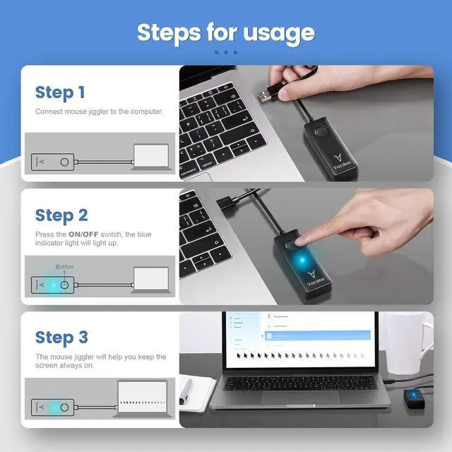 ON/OFF Switch Different from other mouse jiggler on the market, Vaydeer mouse jiggler is more convenient to use thanks to the exclusive ON/OFF switch. Just one simple press, the mouse jiggler will start to work or stop working, protecting the USB ports of your computer from the damage caused by plugging and unplugging constantly.