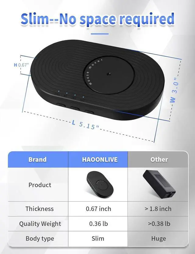 No Install, No SettingRequires only a 5V wall adapter or computer USB port to power the mouse mover, next you can place the mouse to work. During working, the operation sound of the mouse mover does not exceed 25 dB, will not overheat, it is safe and stable. (PS: Item does not include charger)