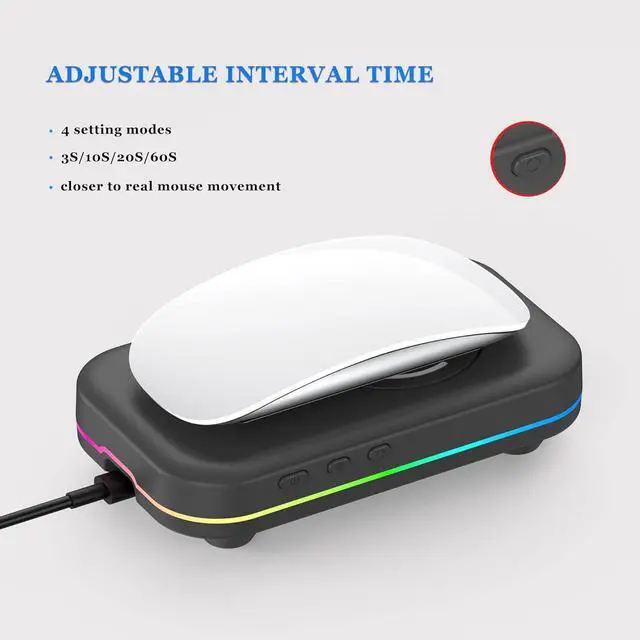 Adjustable Interval Movement Time: With adjustable interval time, 4 cycle settings of 3s/10s/20s/60s. The wheel will operate intermittently depending on your settings, keep working until it is turned off. That means the cursor moves at different times and paths, rather than a fixed route and time which is closer to real mouse movement. With an ON/OFF switch, no need to plug in and out again which can prevent the USB port damage