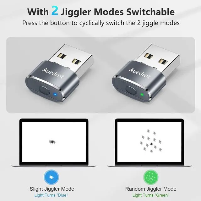 [METAL MATERIAL WITH SWITCH BUTTON] -- This mouse jiggler is made of aluminum alloy, which is more upscale and sturdy than plastic. With the on/off/modes switch button, "Short Press" to turn on/switch between "Slight Jiggler Mode" and "Random Jiggler Mode", "Long Press" to turn off. The indicator lights on/off indicating that the mouse jiggler is turned on/off.