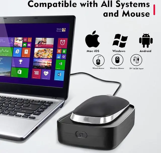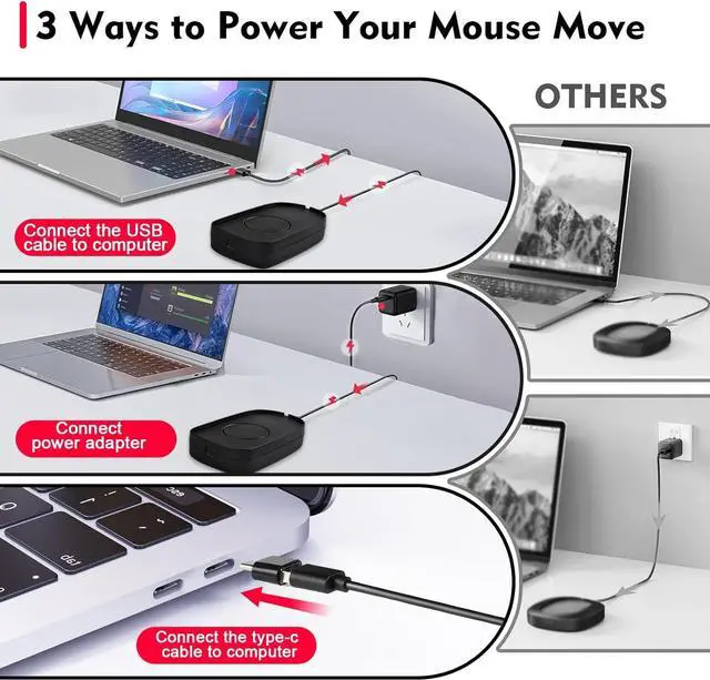 Easy To UseThe mouse jiggler can simply plug into a 5V wall charger or USB port. Complimentary USB converter, can also be used via type-c interface. This mouse shaker is compatible with all operating systems Windows XP/7/8/10, Mac OS, Linux system, etc.
