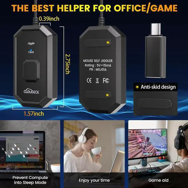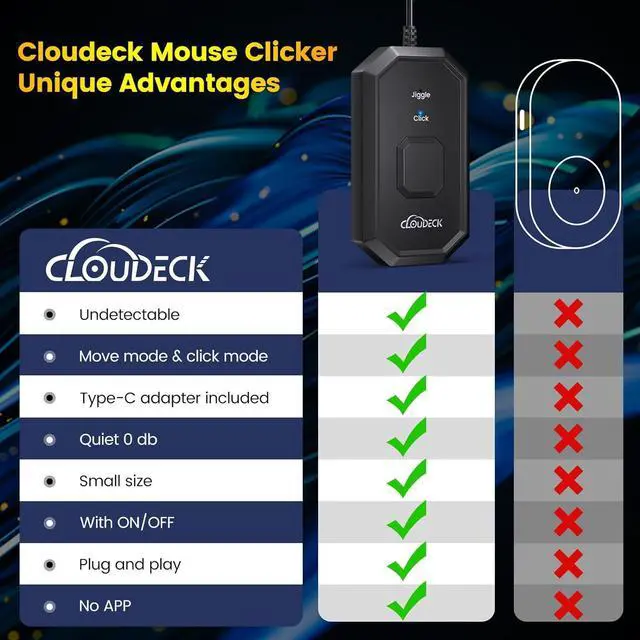 UNIQUE 2-IN-1 DESIGN Different from any other mouse jiggler, Cloudeck mouse jiggler is integrated 2 functions in one button. Use it as simulate mouse mover to prevent the computer from sleeping or hibernation, or as an auto clicker to do click works. 2 modes can be switched at any time.