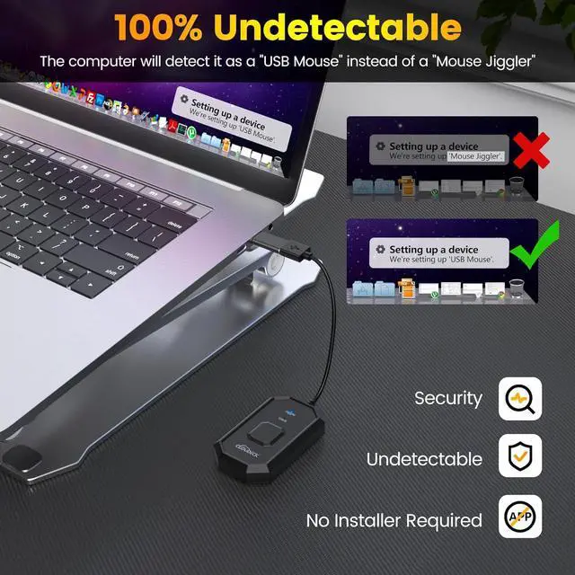 ON/OFF SWITCH DESIGN Cloudeck mouse jiggler is more convenient to use thanks to the special ON/OFF switch. Just one simple press, the mouse jiggler will start to work or stop working, protecting the USB ports of your computer from the damage caused by plugging and unplugging constantly.
