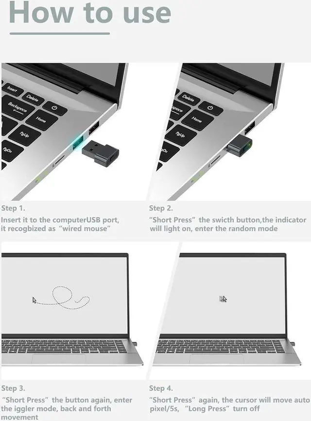 [High Quality Metal Material]: Mouse jiggler design from American and is made of aluminum alloy, stronger and more durable. A switch controls the jiggler on/off and mode switching, "short press" to switch between the 2 modes, "long press" to turn off; no need to plug and unplug frequently to prevent damage to the computer; The indicator light is on to indicate that the mouse jitter is on;