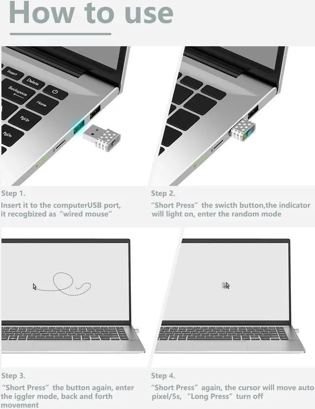 HIGH QUALITY METAL MATERIALThis automatic mouse jiggler designs from American, which made of aluminum alloy, stronger and more durable mouse mover jiggler automatic undetectable. A switch controls the automatic mouse shaker on/off and mode switching, "short press" to switch between the 2 modes, "long press" to turn off; no need to plug and unplug frequently to prevent damage to the computer; The indicator light is on to indicate that the automatic mouse mover jiggler is on.