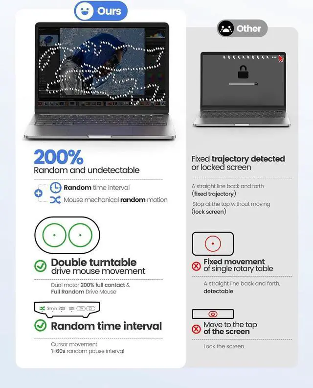Tranquil & 100% UndetectableThe dual turntable undetectable mouse jiggler adopts the principle of pure physics to automatically simulate the process when using a mouse. Because of the twin turntables, it makes a fully random trajectory. Quiet and noiseless during use, 100% undetectable mouse mover device!