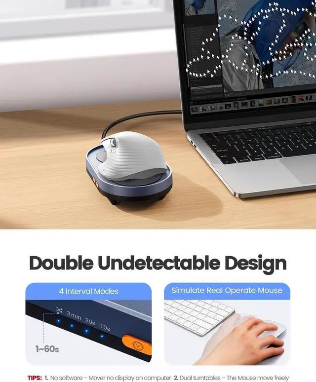 Timer AdjustableTwin turntables mechanical mouse mover has both a switch button ON/OFF and a button to adjust the interval time. No needed software, Plug in the power supply and press the ON/OFF button to start. To adjust the rotation interval, please press the interval button on the side, there are 4 modes that can be selected, namely 10S, the 30S, 3min and 1-60S random.