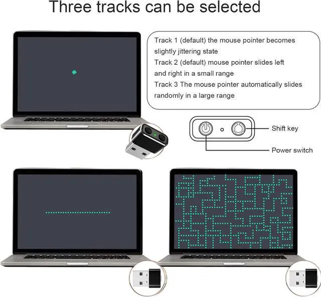 Change Modes The Mouse Wiggler has two modes. Use the on/off/mode switch button, short press to switch the mode of the shaker, and "long press" to turn it off. Avoid repeatedly plugging and unplugging the mouse mover.