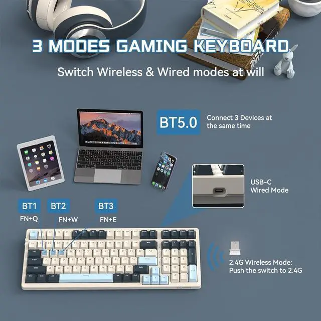 Wide Compatibility with Win/MacConsidering the dfferent needs of win/mac system, this wired wireless gaming keyboard support win/mac dual system switch with corresponding different FN combination key function, offer unlimited use for gamer, worker, coder. Matched with braided coiled cable, level up your keyboard decoration when in wired mode, the attached switches, keycap puller and swicth puller allow you customize your keyboard when you need.