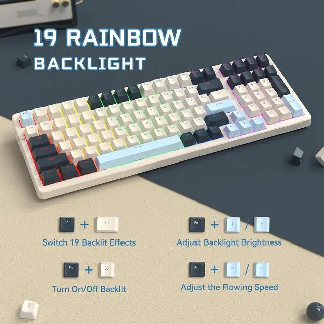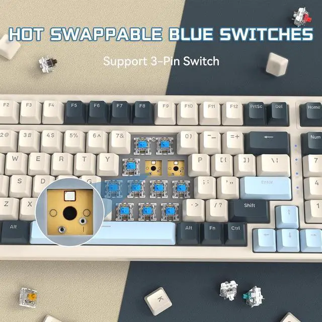 Compact&Retro Color ThemeThis 96% mechanical gaming keyboard is designed with 100 key keyboard size and inspiring classic three color scheme, reserves the essential area of the modifers, arrow key, seperate numpad, and function row which a full size keyboard has when saving space, gather the functionality and aesthetic in one board, more practical and no boring, each keycap is removable, you can DIY your own keyboard with the keycap color you need to fit your deskroom setup at will.
