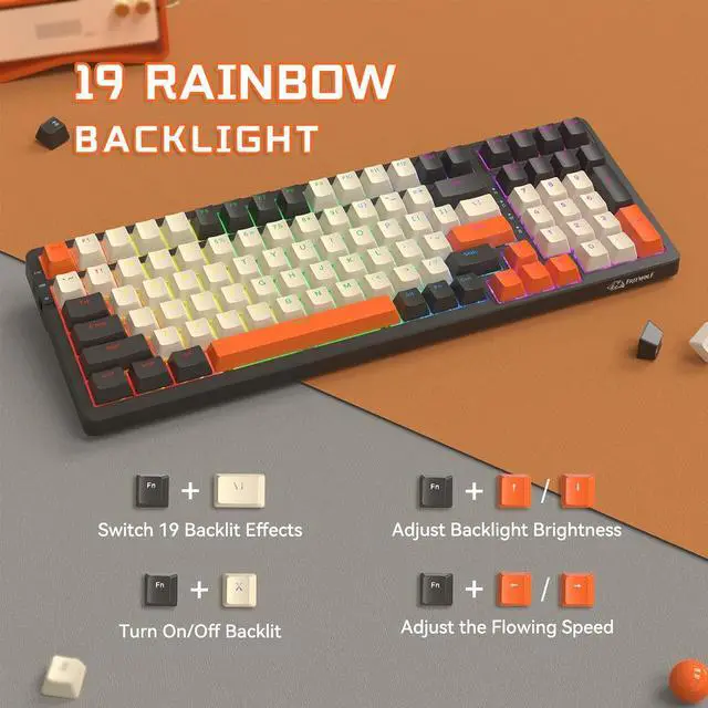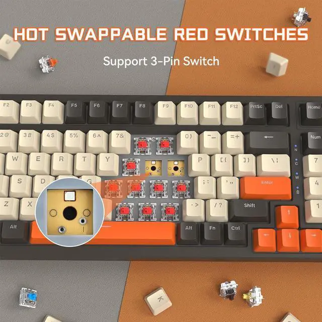 Compact&Retro Color ThemeThis 96% mechanical gaming keyboard is designed with 100 key keyboard size and inspiring classic three color scheme, reserves the essential area of the modifers, arrow key, seperate numpad, and function row which a full size keyboard has when saving space, gather the functionality and aesthetic in one board, more practical and no boring, each keycap is removable, you can DIY your own keyboard with the keycap color you need to fit your deskroom setup at will.