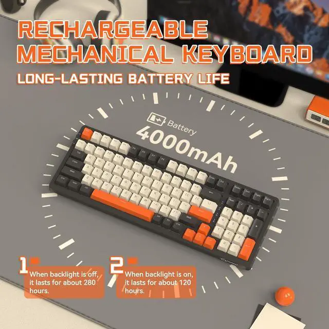 Multi-Device ConnectionAdopting the popular triple mode connection technology, this FREEWOLF RK-K8 mechanical gaming keyboard support Type-c wired, 2.4G hz Wireless and Bluetooth 5.0 connection (support switching among 3 Bluetooth device), allowing a seamless transition among up to 5 device in triple mode, equipped with large capacity 4000mAh battery, ensure a long lasting using time, portable and useful, perfect balance all your needs when gaming, working, daily using or business trip.