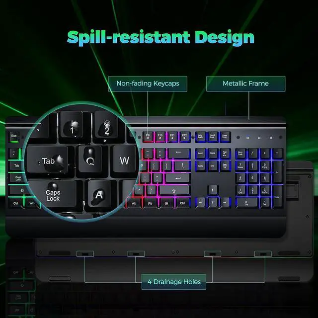 Premium Metal Panel KeyboardOur rainbow backlit keyboard boasts a sleek matte metal panel that not only adds a touch of elegance but also provides enhanced durability and water resistance. Worried about accidental spills? Fear not! We've got you covered with four cleverly placed drainage holes, ensuring that liquid mishaps won't harm your precious typing companion.