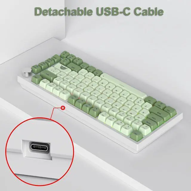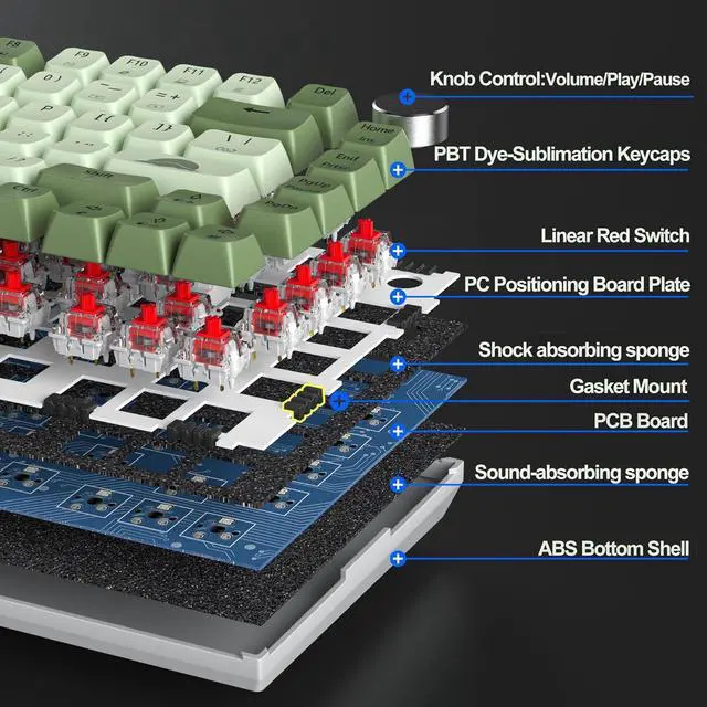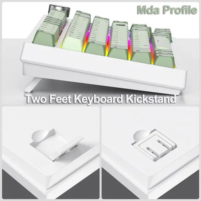 Ergonomic & Durable PBT KeycapsThe MDA profile stepped keycaps and two-step kickstand provide a comfortable typing angle and reduce your hand wrist fatigue; Thick PBT keycaps make this keyboard more durable and not easy to fade; and extra personalized dye-sublimation keycap available for DIY; A rotary knob to control the volume/play/pause