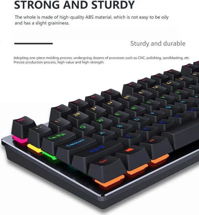 ABS Keycaps This gaming keyboard features ABS keycaps to provide a smooth texture which easily glides your fingers across the keyboard. The Fine Two-Color and Transparent design greatly enhances your typing experiences and accuracy at night.