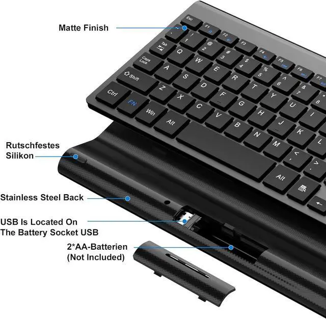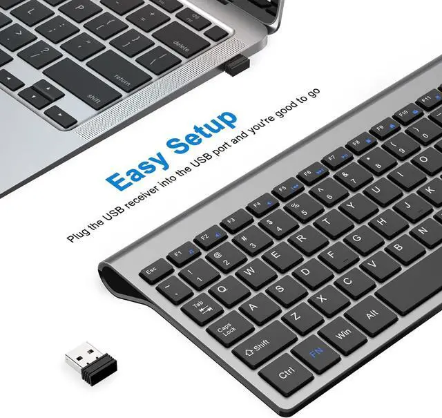 2.4G Wireless Keyboard: The computer keyboard uses 2.4G technology, which ensures a more stable connection. No driver and no installation required, the wireless keyboard is quickly connected to your PC computer, plug and play. Their working range up to 10 metres (33 feet) (USB is located on the battery socket)
