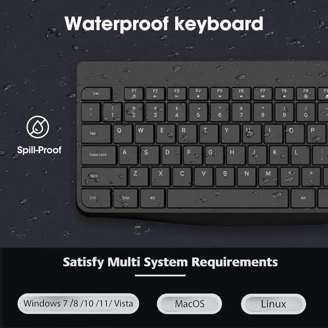 [Full Size and Waterproof Design]The waterproof design adds durability and protection against accidental spills. Full size keyboard comes with a numeric keypad and multi-function keys, improving your work efficiency. There are 5 multimedia keys and 12 shortcut functions (ONLY applies to the Windows)