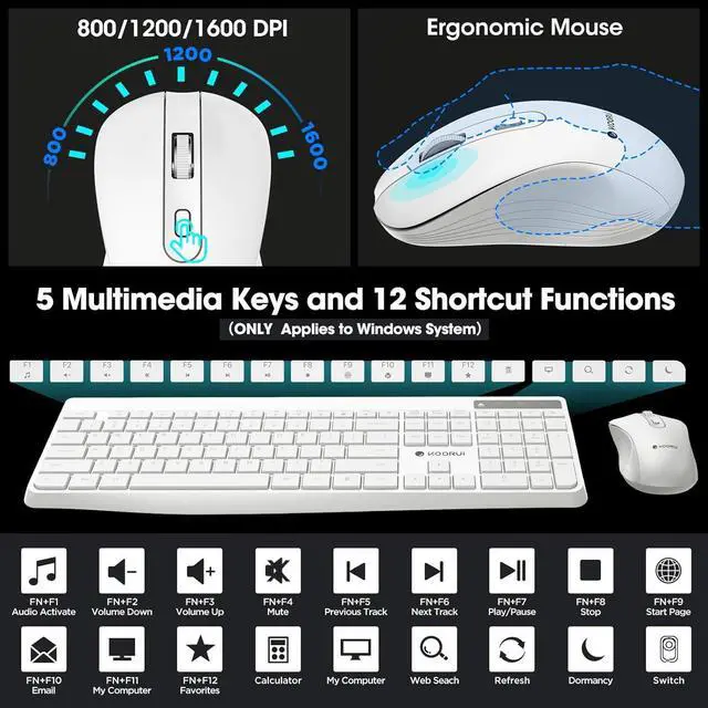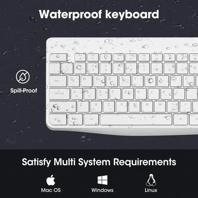 [Full Size and Waterproof Design]The waterproof design adds durability and protection against accidental spills. Full size keyboard comes with a numeric keypad and multi-function keys, improving your work efficiency. There are 5 multimedia keys and 12 shortcut functions (ONLY applies to the Windows)