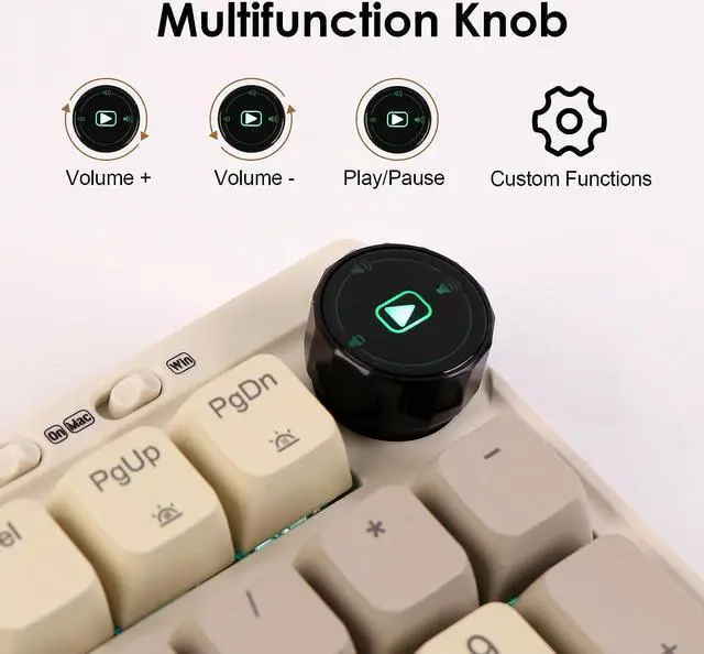2-in-1 Customizable Knob, Mac & Win Double LayoutOne of the highlights of this keyboard is the classy knob that can respond to turn or twiddle at all 360 degrees and register keystrokes for many custom functions one sees suits it. By default, the knob can be used for media control such as turning the volume up/down and pausing or resuming play for music and video.