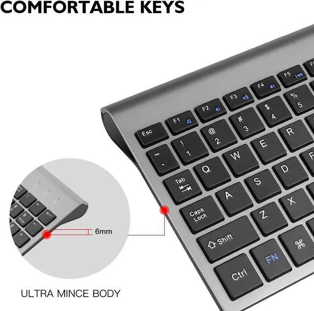 Slim and Ergonomic Design The slim keyboard has a tilt angle for the great typing position. Sweat-resistant, skin-friendly finish wireless mouse in contoured shape would provide hours of work comfortably. The full size keyboard type fast with numeric keypad and instant access your music, internet, e-mail, volume, etc by multi-media hot keys(The hot-keys not fully compatible with Mac System)
