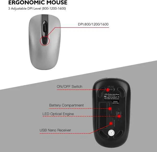 HIGH PRECITION Wireless Mouse DPI 1600 in 3 levels- You can easily change the cursor sensitivity of this cordless mouse depending on your activities; usually 800 DPI for office, DPI 1200-1600 for 4K resolution monitor or entertainment like gaming at home. 2 polling rate: 125Hz and 250Hz; adjusted by pressing the right key and the wheel simultaneously at 3s for change.