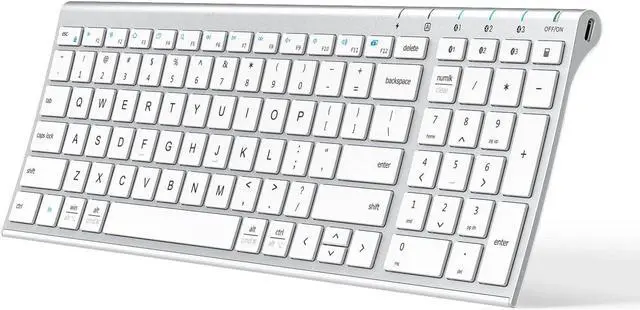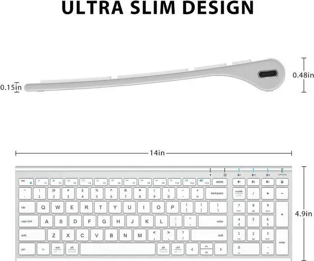 FULL SIZE & ULTRA-SLIM KEYBOARD -- The iClever wireless keyboard is full-size design and includes numeric keypad which makes typing easier and more comfortable than other keyboards. Its layout is industry standard which features hot keys like Mute, play/pause, backward and forward, volume up and down, helping you to increase your workflow and productivity. The wireless keyboard's slim design (14x 4.9 x 0.15 in) ensures that it can be tucked easily into a backpack or the pocket of your laptop.