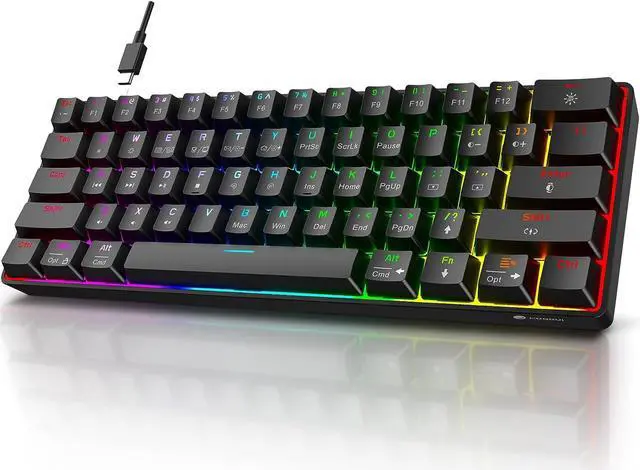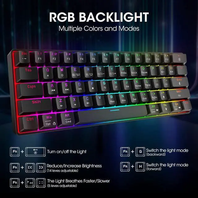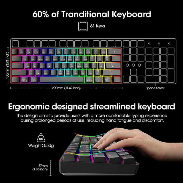 [61 Keys with Gorgeous Backlighting] The 60% gaming keyboard can save desk space. The detachable Type-C cable and small size make it easy to carry around for home/office use or business trips. It offers 26 backlighting modes with RGB effects, providing over 16 million color combinations to personalize your keyboard's appearance