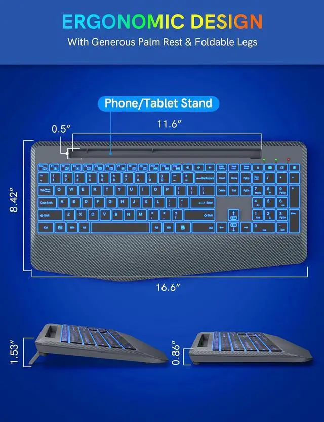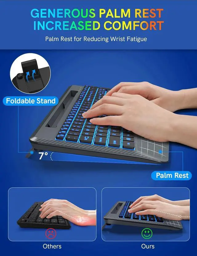 Ergonomic Palm RestOur light up keyboard with wrist rest and foldable stand design improves overall comfort and reduces pressure on hands and wrists. Helps your wrist to be in a comfortable position and better body posture. Perfect for those Office-men needing long time working with the keyboard.