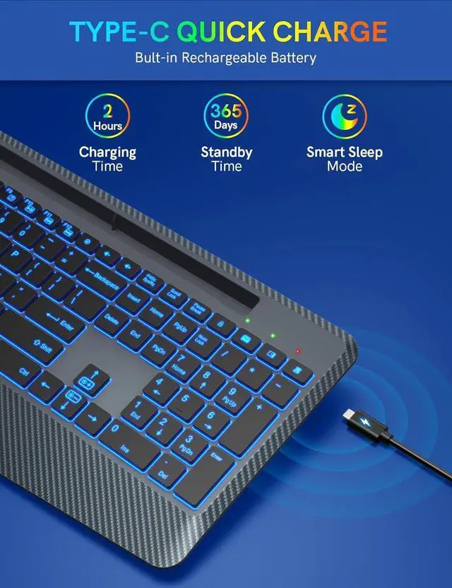 Rechargeable and Long Lasting The rechargeable wireless keyboard is equipped with Type-C charging cable, one charge has an extra long standby time of 24 months, This ergo keyboard has automatic sleep power saving mode and a separate ON/OFF switch. You can also adjust the light brightness at any time or turn off the light to save power.