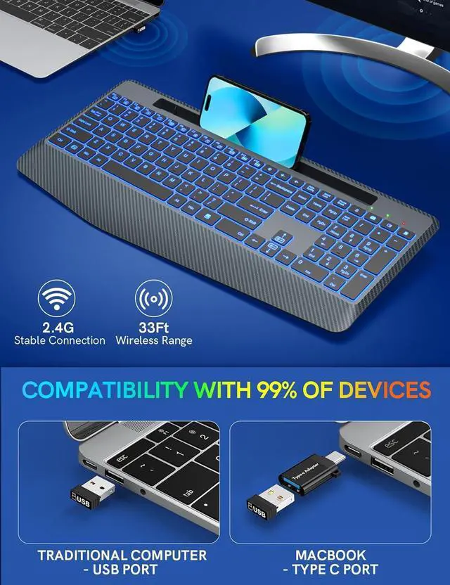 Quiet and Comfortable TypingThe responsive low profile keys offer fluid, quiet, laptop-like efficient typing. Our backlit wireless keyboard remove over 95% of disruptive sounds. Designed with convenience tablet/phone holder. You can work like using a laptop when place a tablet, or watch video while working.