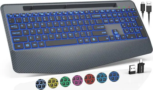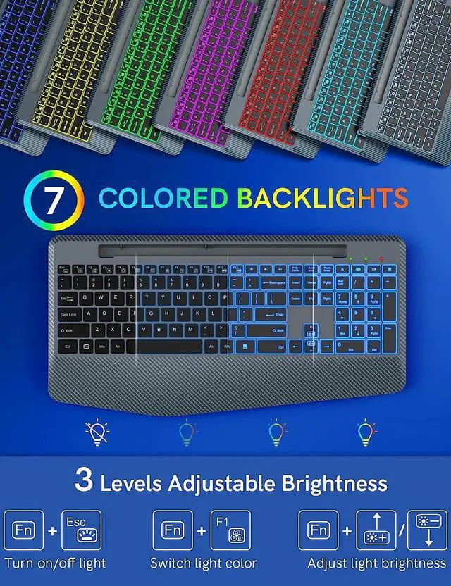 7 Switchable Colors Backlight The ergonomic wireless keyboard comes with 7 switchable backlights and 3 brightness levels to provide you with a different visual typing atmosphere. Choose your favorite keyboard setting and take your desk setup to the next level. The keys will be clearer under the backlight, too. Let you work effortlessly in the dark typing.