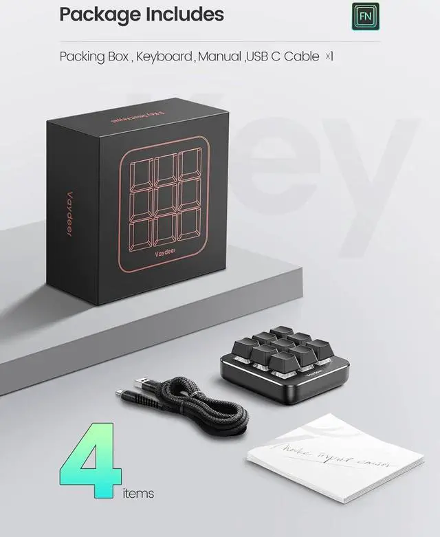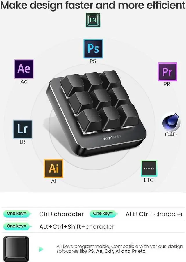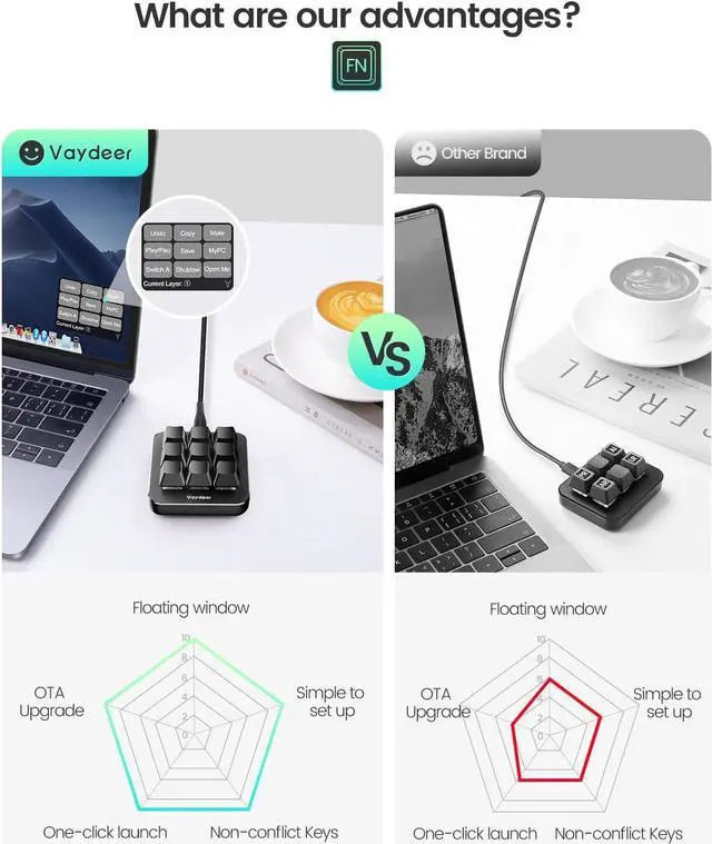 User-Friendly Interface and Floating WindowWith user-friendly interface and real-time floating window, you will never forget the function of the key being used at the moment. This one handed macro mechanical keyboard can make your work faster and more efficient, and make the game experience more comfortable and smooth. Besides, you can carry the macro keyboard anywhere due to the compact and elegant design. Ideal Christmas gift for gamers, designers and office workers.
