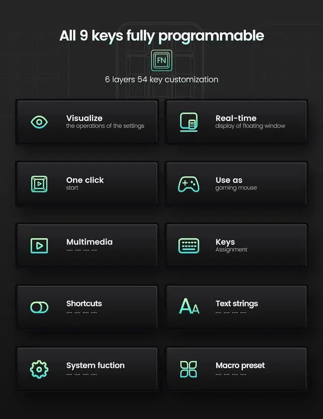 6 Functional Layers and 9 NKRO Keys6 customizable functional layers for diferent scene. One for gaming, one for designing, it's up to you. And you can switch between layers by scrolling the mouse in the floating window area, or you can switch layers automatically based on the application you are using. 9 non-conflict Keys with macros allows you to press or hold multiple keys simultaneously, giving you accurate response with high speed and experiencing a new level of gaming and typing. Ideal Christmas gift for gamers, designers and office workers.