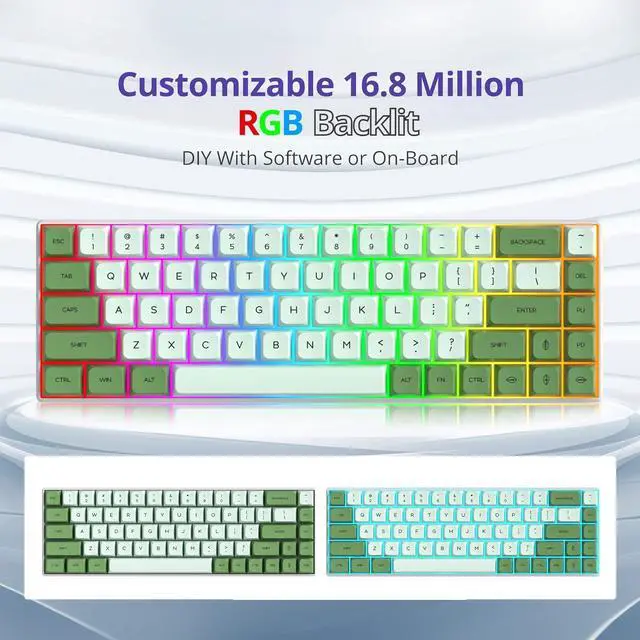 RGB Backlit Effect65 percent rgb mechanical keyboad with 16.8 Million Color combinations, Built-in multiple lighting effects and solid color backlight mode, full color backlight. Multiple brightness level breathing speed precision engineered keycaps offering crystal clear uniform backlighting